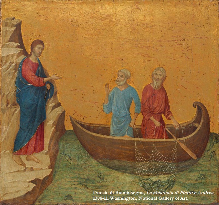 Segue invece la chiamata dei primi discepoli. Conviene ricordare che, secondo tradizione, normalmente è l’allievo che sceglie il maestro e non viceversa. Gesù invece, rovesciando i termini del rapporto, dà a esso tutte le caratteristiche della chiamata urgente, che viene ben colta dalle due coppie di fratelli (cf. eutheos aphentes, 4,20.22). Nonostante l’urgenza, la scena conserva tutte le caratteristiche della quotidianità: ci sono persone intente al loro lavoro e c’è un uomo che passeggia lungo le rive del lago.