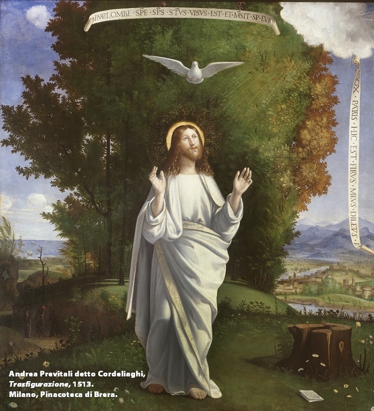 Gesù prese con sé Pietro, Giacomo e Giovanni e li condusse su un alto monte (cf. Mc 9,2) e lì si trasfigurò, poi «venne una nube che li coprì con la sua ombra» (Mc 9,7). La voce uscì proprio dalla nube. Essa ripeté le stesse parole udite al battesimo al Giordano: «Questi è il mio figlio, l’amato, ascoltatelo!» (Mc 9,7; cf. Mc 1,11). Sopra il fiume si squarciarono i cieli, sul monte si è avvolti dalla nube. Sono due immagini destinate a indicare la discesa di quanto proviene dall’alto. Forse non è azzardato affermare che nella Trasfigurazione la nube svolge una funzione analoga a quella compiuta dalla colomba al battesimo: siamo di fronte a due elementi muti che consentono alla parola del Padre di diventar udibile.