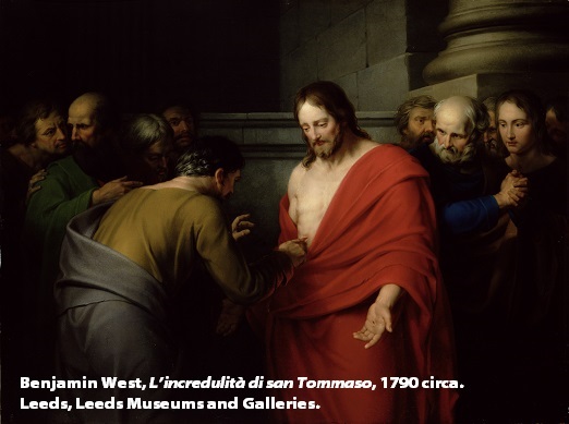 Tommaso chiama in causa i sensi: desidera vedere i segni dei chiodi, si propone di toccare con il dito la piaga del costato. Egli mira ad avere la garanzia che il Risorto non ha deposto la carne; vuole esser certo che egli sia proprio il Verbo venuto ad abitare in mezzo a noi (cf. Gv 1,14). A lui non è sufficiente ascoltare la parola, neppure gli basta il semplice vedere: la vista deve sfociare nel tatto.
