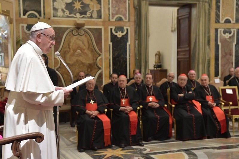 Dopo aver affrontato il «catalogo delle malattie curiali» nell’incontro con la curia romana per lo scambio degli auguri natalizi nel 2014 e quello delle «virtù necessarie» nel 2015, papa Francesco aveva dedicato l’appuntamento del 2016 al tema della riforma della curia romana che è in itinere, illustrandone i passi compiuti e le prospettive di sviluppo futuro. Anche l’incontro del 21 dicembre 2017 ha insistito su quest’ultimo tema, soprattutto in riferimento alla «realtà della curia ad extra, ossia il rapporto della curia con le nazioni, con le Chiese particolari, con le Chiese orientali, con il dialogo ecumenico, con l’ebraismo, con l’islam e le altre religioni, cioè con il mondo esterno». Accennando alle difficoltà che la riforma sta incontrando e assumendo a tratti toni severi, come laddove rimarca il comportamento dei «traditori di fiducia o degli approfittatori della maternità della Chiesa», Francesco ha richiamato l’istituzione al suo profilo diaconale, cioè al suo essere al servizio del papa e delle Chiese locali: «Cogliere le istanze… le grida, le gioie e le lacrime delle Chiese e del mondo in modo da trasmetterle al vescovo di Roma al fine di permettergli di svolgere più efficacemente il suo compito… Con tale recettività, che è più importante dell’aspetto precettivo, i dicasteri della curia romana entrano generosamente in quel processo d’ascolto e di sinodalità di cui ho già parlato».
